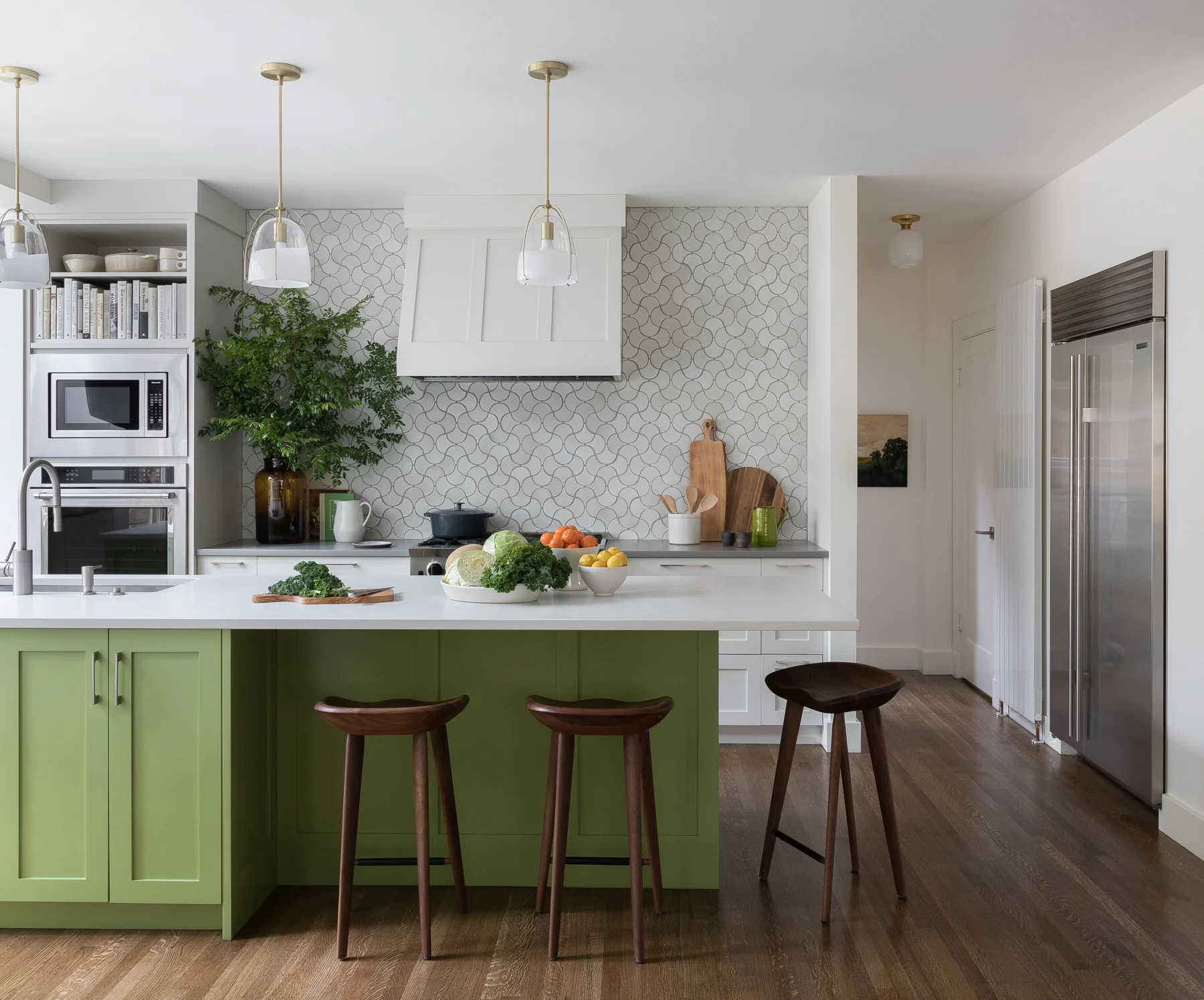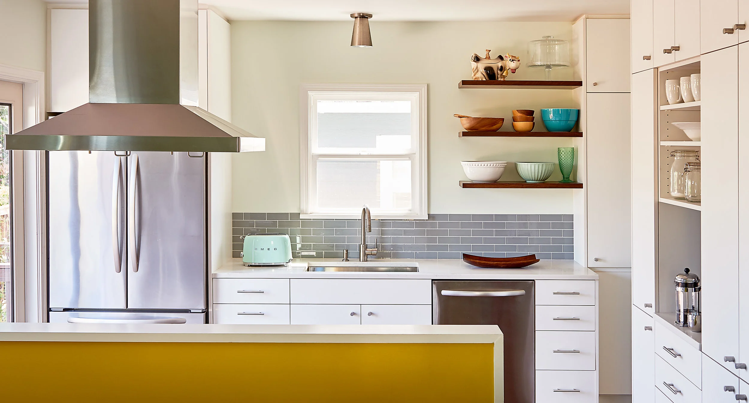 This mid century house had not been upgraded since...the mid century. The design involved opening up a wall between the kitchen and living room and bringing the cabinetry and appliances up to date, while making the whole living space lighter and brighter.